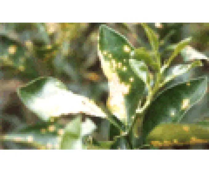 Bệnh gây hại trên thân, cành, quả và trên lá. Vết bệnh ban đầu là các đốm mầu vàng, sau đó lan rộng và có mầu vàng tươi. Vết bệnh già chuyển sang mầu nâu vàng, nổi gờ, xung quanh vết bệnh có quầng mầu vàng. Các vết bệnh có thể liên kết với nhau thành từng đám. Bị bệnh nặng lá và quả bị rụng sớm. Trên cành và thân cây bị bệnh sẽ làm cây chậm phát triển và khô cành.