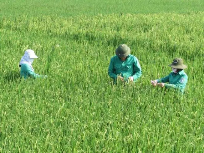 Cán bộ Phòng Kỹ thuật - IPM kiểm tra sâu bệnh định kỳ trên lúa giai đoạn trỗ bông tại Thụy Vân - Việt Trì