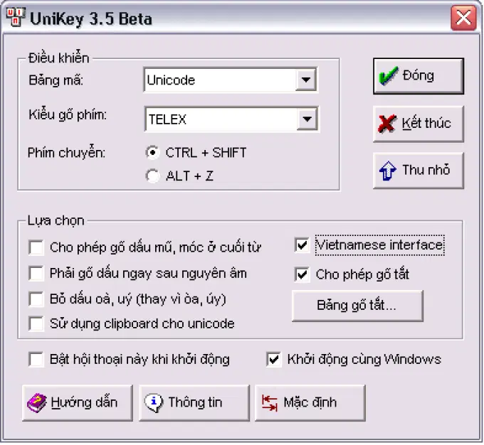 Khởi động cùng Windows: Tự động bật UniKey mỗi khi Windows khởi động. Nếu bạn chọn mục này, hãy nhớ xoá bỏ shortcut của UniKey trong Startup Menu nếu có.