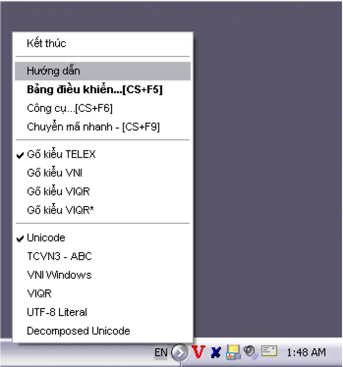 Qua menu bạn có thể: mở bảng điều khiển, mở hộp công cụ, thực hiện chuyển đổi nhanh thông qua clipboard, chọn kiểu gõ (TELEX, VNI, VIQR) hoặc bảng mã tiếng Việt. Nếu bạn không nhìn thấy bảng mã mình cần được hiển thị trên menu thì hãy mở bảng điều khiển và chọn bảng mã đó, sau đó bảng mã này sẽ xuất hiện trong menu.
