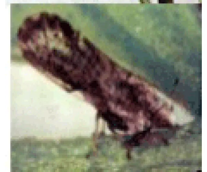 Trưởng thành dài từ 2,5- 3mm, cánh dài màu nâu đậm xen kẽ vệt trắng chạy từ đầu đến cuối cánh. Khi đậu, phần cuối cánh vếch cao hơn phần đầu, nên có tên gọi là rầy chổng cánh.