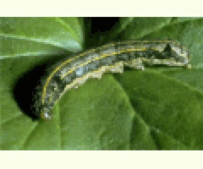 màu đen, nâu tối, đốt bụng thứ nhất có một vết đen to bao quanh, trên mỗi mảnh lưng có vân hình trăng khuyết. Sâu non có 6 tuổi, khi đẫy sức ở tuổi 6 dài từ 35 - 50 mm.