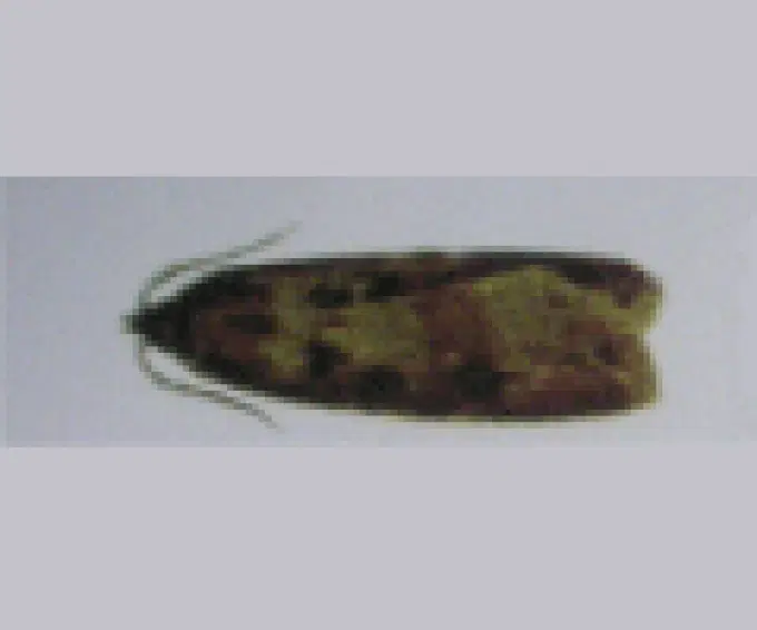 Ngài dài 16 - 23 mm. Mép ngoài cánh trước có 6 chấm đen, giữa cánh có vân hình quả thận, hình tròn và gân hình gậy. Cánh sau màu trắng tro, mạch gân và gần mép ngoài cánh có màu nâu.